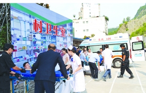 笛聲急促,閃爍著救護燈的兩輛救護車駛?cè)氪逍l(wèi)生室,醫(yī)務(wù)工作者提著出診箱、抬著擔(dān)架走進事故現(xiàn)場。