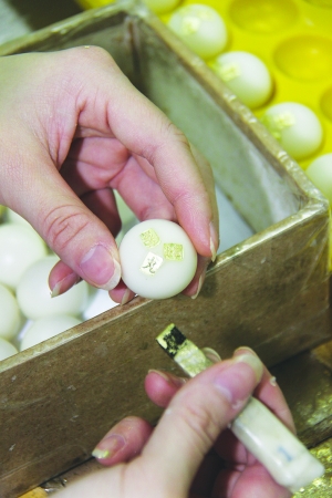 很多人都知道,最極品的安宮牛黃丸外面裹著一層薄薄的金箔,取其墜痰鎮(zhèn)固的功效,這也是同仁堂的“獨門秘笈”。記者在安宮牛黃丸生產(chǎn)線看到,工人師傅拿過一張不及郵票大的金箔,將藥丸放在上面輕輕一推,就輕巧、均勻地給小藥丸“穿上了金衣”?!肮鸩瓷先ポp巧,可其中的技巧卻不簡單。推藥丸時,勁兒大了,金箔就會被藥丸吃進去,勁兒小了則包得不瓷實。手愛出汗的人還干不了這道工序?!睆埗氛f,一個工人想要把這道工序干好,至少要練半年。