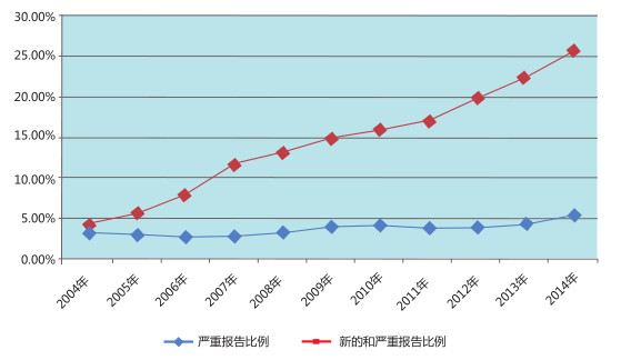 圖3 2004-2014 年新的和嚴(yán)重以及嚴(yán)重藥品不良反應(yīng)/事件報告比例