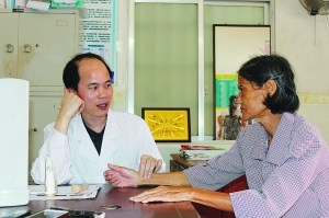 就在交談過程中,來自湛江市麻章區(qū)太平鎮(zhèn)的陳大媽過來就診。在陳天豐號脈過程中,她很努力地用普通話對記者贊道:“他很好?!笨吹接浾邔χ愄熵S豎起大拇指,她認真地點點頭。陳天豐低著頭笑了。