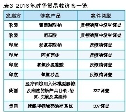 2016年,我國(guó)醫(yī)藥產(chǎn)品共遭遇8起國(guó)外貿(mào)易救濟(jì)案,涉案產(chǎn)品不僅包含葡萄糖酸鈉、酒石酸、雙氯芬酸鈉、阿莫西林、氧氟沙星羧酸、氧氟沙星等優(yōu)勢(shì)原料藥,也涉及醫(yī)療訓(xùn)練用人體模型器械、睡眠呼吸障礙治療系統(tǒng)等我國(guó)日益強(qiáng)大的醫(yī)療器械領(lǐng)域(見表3)。面對(duì)貿(mào)易救濟(jì)案件數(shù)目的增加,中國(guó)醫(yī)藥保健品進(jìn)出口商會(huì)會(huì)同相關(guān)企業(yè)積極應(yīng)對(duì)并取得成效,如2016年歐盟對(duì)華酒石酸反傾銷案的應(yīng)訴,是惟一經(jīng)過兩次日落復(fù)審和多次期中復(fù)審仍舊保持零稅率的案例。該案例已成為應(yīng)對(duì)歐盟貿(mào)易救濟(jì)案件的經(jīng)典案例。(實(shí)習(xí)記者 落楠)