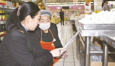 圖為西安市雁塔區(qū)食藥監(jiān)管人員對超市聯(lián)營小作坊一票通使用情況進(jìn)行檢查。賀一辰 攝