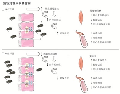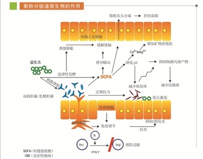 菊粉,在國際上要求其水溶性膳食纖維含量不低于90%,我國國標(biāo)則不低于86%。早已被營養(yǎng)學(xué)界稱為“第七大營養(yǎng)素”——膳食纖維的菊粉,同時兼具益生元功效。由于人和動物體內(nèi)都缺乏分解菊粉的酶類,所以菊粉被人體攝入后,通常不能被胃和小腸吸收,但會被結(jié)腸中的雙歧桿菌、乳酸菌發(fā)酵,從而促進腸道益生菌的產(chǎn)生,改善腸道微生態(tài)環(huán)境,因而被稱為重要的雙歧桿菌增殖因子。菊粉被有益菌發(fā)酵利用后產(chǎn)生短鏈脂肪酸,降低腸道內(nèi)pH值,從而促進人體對礦物質(zhì)的吸收,并改善便秘。在腸道末端前,菊粉自身就發(fā)酵成短鏈脂肪酸和乳酸鹽,消耗體內(nèi)膽固醇,抑制其在肝臟內(nèi)的合成(見圖1)。美國科學(xué)家Yamashita曾讓18名高脂血癥病人連續(xù)進食菊粉兩周,每天10克,結(jié)果發(fā)現(xiàn)總膽固醇減少7.9%,低密度脂蛋白膽固醇下降10.4%;連續(xù)4周在12名年輕的健康男子每日的早餐中添加15克菊粉,總膽固醇量減少8.2%,甘油三酯則大幅下降26%。研究發(fā)現(xiàn),長期食用菊粉,有利于血脂降低,阻斷心血管病形成渠道,預(yù)防冠心病等嚴重后果。