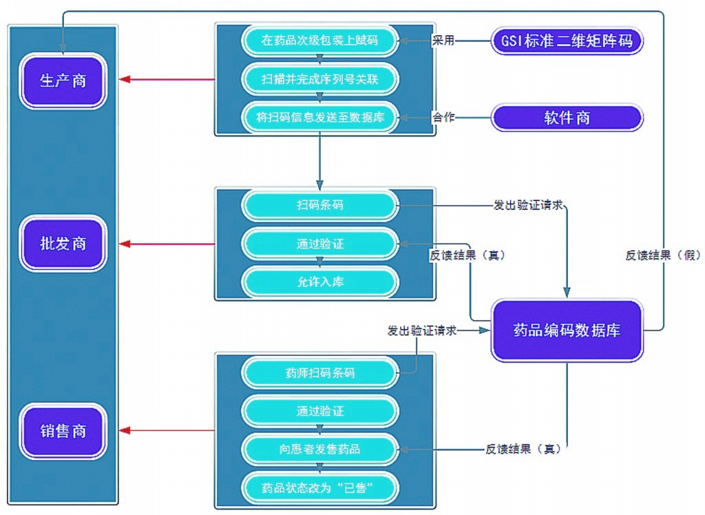 藥品供應鏈中的其他參與者(如批發(fā)商)在取得系統(tǒng)認可后,可自愿在任何時候通過掃描藥品包裝上的二維矩陣碼發(fā)出驗證請求,以確認藥品信息。另外,EMVS指導委員會計劃在EMVS系統(tǒng)運行的第二階段,由藥品分銷商通過已有數(shù)據(jù)交換網(wǎng)絡添加相關信息,進而建立藥品全程追蹤系統(tǒng)。