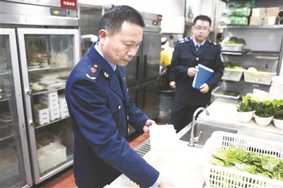 圖為G20杭州峰會(huì)期間,王金超(左)在檢查餐飲單位后廚