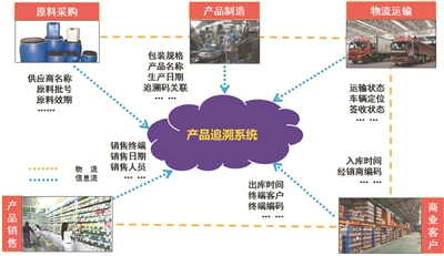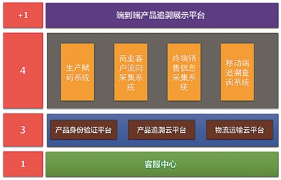 “1”是指建立1個客服中心,對外向商業(yè)客戶、消費者提供產(chǎn)品質(zhì)量、用法、真?zhèn)涡畔⒉樵兒头答?,要為客服中心開放必要的追溯系統(tǒng)查詢權(quán)限?!?”是指3個平臺:第一個平臺是指存放追溯系統(tǒng)相關(guān)服務(wù)器、存儲資源的云平臺,定位在IaaS層面;第二個平臺是指多個企業(yè)、多條生產(chǎn)線共用的產(chǎn)品身份驗證平臺,定位在SaaS層面;第三個平臺是指物流運輸云平臺,定位在SaaS層面?!?”是指要為上述4個關(guān)鍵節(jié)點,按照追溯的設(shè)計原理,建立對應(yīng)的應(yīng)用系統(tǒng),包括生產(chǎn)賦碼系統(tǒng)、商業(yè)客戶流向采集系統(tǒng)、銷售終端信息采集系統(tǒng)、移動端追溯查詢系統(tǒng)。“+1”是指將整個產(chǎn)品追溯系統(tǒng)中涉及的原料輔料包材供應(yīng)商、生產(chǎn)班次、產(chǎn)品規(guī)格、產(chǎn)品追溯碼、包裝追溯碼、商業(yè)產(chǎn)品流向等各類信息,通過一個集成的平臺進行匯集、展示和分析(在此我們命名為“端到端產(chǎn)品追溯展示平臺”),在出現(xiàn)產(chǎn)品質(zhì)量問題時,在這個平臺上通過輸入“產(chǎn)品追溯碼”或“包裝追溯碼”,就能以鏈條的方式對產(chǎn)品進行銷售時間、銷售終端、商業(yè)客戶出入庫時間、物流承運商、生產(chǎn)批號、原料輔料包材供應(yīng)商等信息進行端到端的可視化追溯。