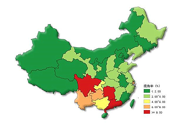 有14個(gè)省的醫(yī)療用藥品濫用/使用率大于全國(guó)平均濫用/使用率(4.0%)。內(nèi)蒙古、陜西、海南3省/區(qū)的濫用/使用率大于10.0%,17個(gè)省的濫用/使用率小于4.0%,其中有10個(gè)省的報(bào)告濫用/使用率低于2.0%。