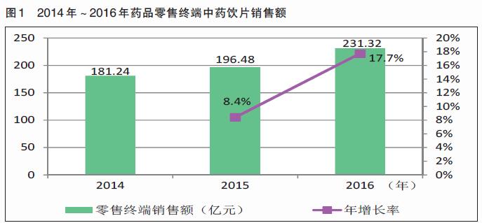 據(jù)統(tǒng)計,2016年中藥飲片零售終端市場的銷售額為231.32億元,同比增長17.7%(見圖1)。其增長速度超過了同年度零售終端西藥、中成藥將近十個百分點,是零售藥店銷售額增長最快的品類。《報告》認(rèn)為,中藥飲片在零售市場表現(xiàn)優(yōu)異,主要得益于國家政策助力中醫(yī)藥的發(fā)展,而消費者養(yǎng)生調(diào)理保健需求的日益提升,也使得中藥飲片在藥品零售市場實現(xiàn)了價值回歸。
