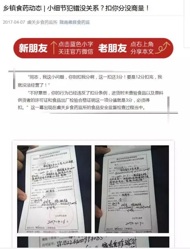 如加入熱點(diǎn)元素、超級(jí)話題,也就是“蹭熱點(diǎn)”。尤其在三線小城鎮(zhèn),當(dāng)?shù)氐臒衢T(mén)話題會(huì)引起更好的反響,在這個(gè)思路下,我們創(chuàng)作了《圍觀!不一樣的家長(zhǎng)會(huì)!》、《驚!村民來(lái)到鎮(zhèn)食藥監(jiān)所辦事,嚇了一跳!》《逛吃,逛吃,吃的安心,廟會(huì)才能逛的開(kāi)心!》等閱讀量和點(diǎn)贊量較高的推送。有時(shí)甚至從整篇文章中,只提煉一個(gè)亮點(diǎn),轉(zhuǎn)變整個(gè)文章的重心。如《小細(xì)節(jié)犯錯(cuò)沒(méi)關(guān)系?扣你分沒(méi)商量!》把一篇紀(jì)實(shí)類(lèi)的日常檢查報(bào)道稿,改成了針對(duì)食品記分管理工作進(jìn)行宣傳普及的推送。