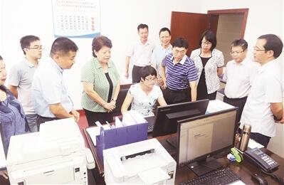 圖為李康(左三)了解廣西食品藥品安全抽檢信息管理平臺建設情況