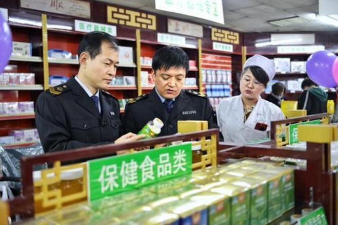 圖為寧夏區(qū)局的執(zhí)法人員在某藥店對保健食品進行檢查。