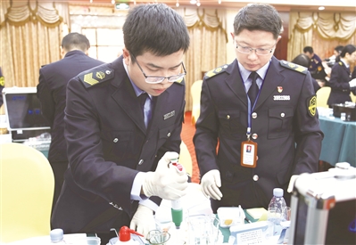 酒店廚房檢查、菜譜審查兩個環(huán)節(jié)結(jié)束之后,便進入了頗具看點的快速檢測環(huán)節(jié):13支代表隊通過現(xiàn)場抽簽并領(lǐng)取待檢測的食品樣品,必須在規(guī)定時間內(nèi),通過現(xiàn)場采樣、調(diào)試檢測儀器、配制標準液、進行理化指標測定等程序,對包括硼砂(米面制品)、農(nóng)藥殘留(果蔬)等8個項目進行快速檢測,最終找出哪些食品樣品不合格。