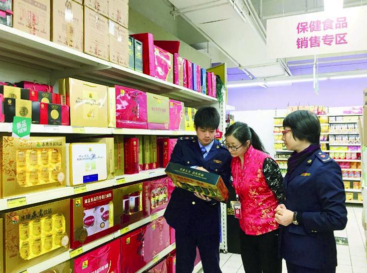 圖為監(jiān)管執(zhí)法人員在超市檢查保健食品質(zhì)量安全情況。