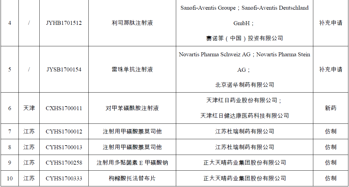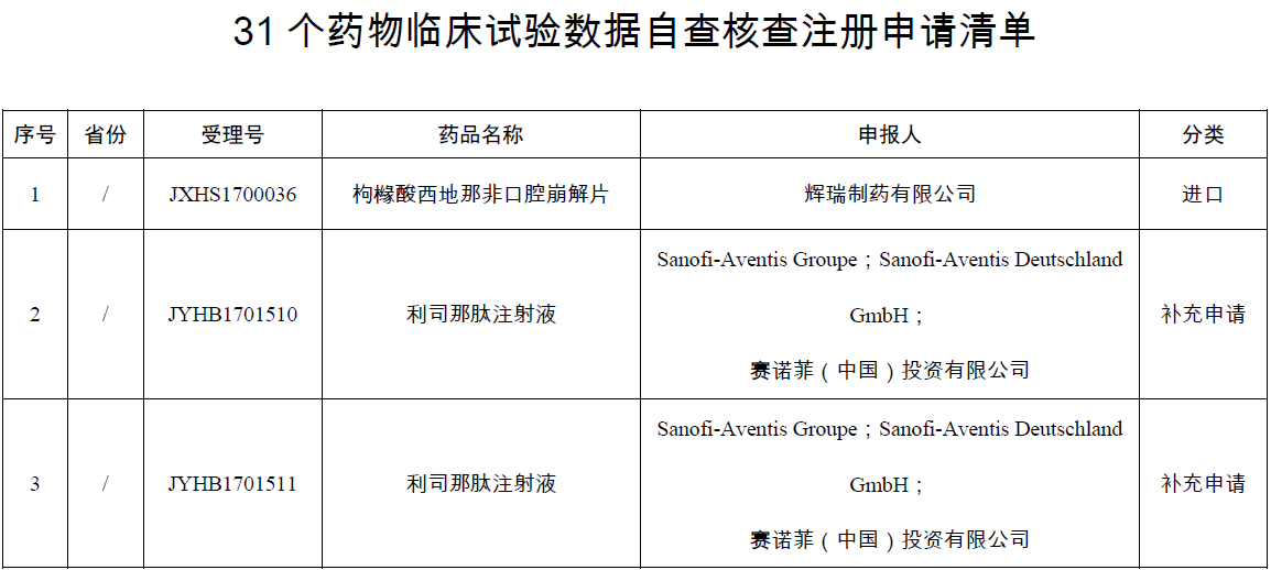 中國(guó)醫(yī)藥報(bào)記者 馬艷紅 報(bào)道 國(guó)家藥品監(jiān)督管理局4月13日發(fā)布第2號(hào)公告,宣布對(duì)新收到的輝瑞制藥有限公司的枸櫞酸西地那非口腔崩解片(受理號(hào)JXHS1700036),賽諾菲(中國(guó))投資有限公司的利司那肽注射液(受理號(hào)JYHB1701510),北京諾華制藥有限公司的雷珠單抗注射液(受理號(hào)JYSB1700154),天津紅日藥業(yè)股份有限公司、天津紅日健達(dá)康醫(yī)藥科技有限公司的對(duì)甲苯磺酰胺注射液(受理號(hào)CXHS1700011)等31個(gè)已完成臨床試驗(yàn)申報(bào)生產(chǎn)或進(jìn)口的藥品注冊(cè)申請(qǐng)進(jìn)行臨床試驗(yàn)數(shù)據(jù)核查。