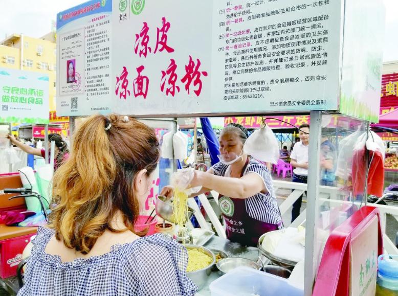 食品“小攤販”集中經(jīng)營自主管理 在佛山市南海里水新天地廣場經(jīng)營涼皮生意的晏行翠,來自河南。她告訴記者:“過去的十多年我一直被城管追著跑,現(xiàn)在可以安心經(jīng)營了?!标绦写涞臎銎n口掛有“廣東省食品攤販登記卡”“食品安全承諾書”,這都是佛山食品“小攤販”治理的成果。