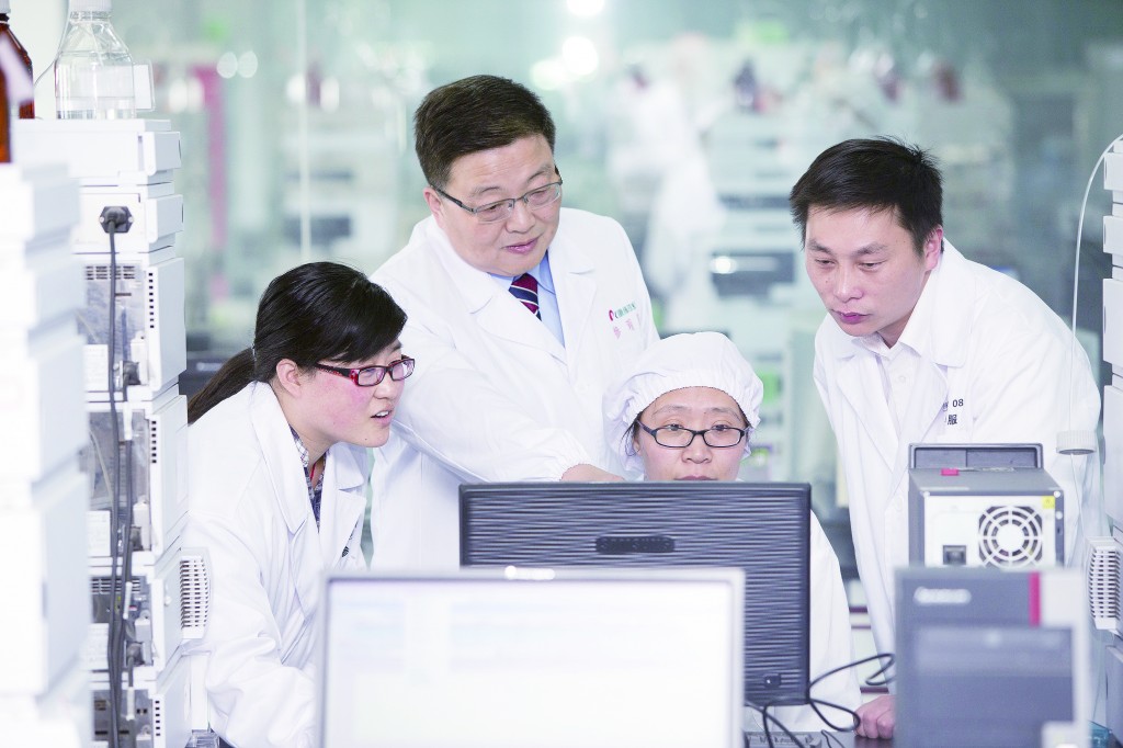 圖為康緣藥業(yè)董事長(zhǎng)肖偉(左二)與實(shí)驗(yàn)室科技人員一起探討科研問(wèn)題。 康緣藥業(yè)供圖