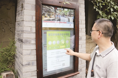 通過互動(dòng)屏幕,消費(fèi)者可以查閱成都錦里小吃街每家餐飲服務(wù)單位的食品安全相關(guān)信息。