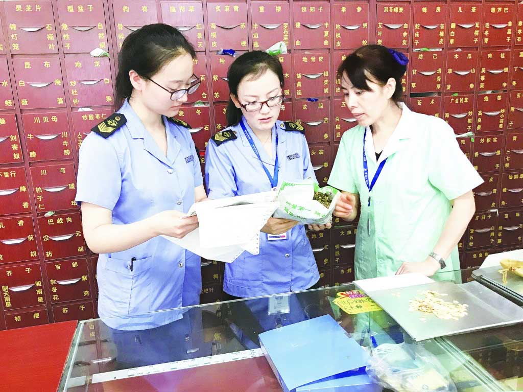 圖為8月4日,太原市晉源區(qū)食品藥品監(jiān)管局義井監(jiān)管站執(zhí)法人員在藥店檢查中藥材質(zhì)量安全及購銷臺賬管理情況。