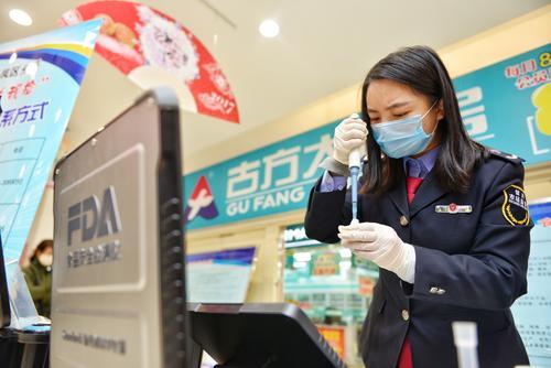 監(jiān)管人員對(duì)保健食品進(jìn)行快速檢測(cè)。