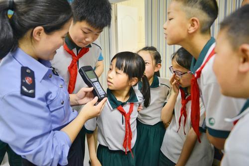 監(jiān)管人員向?qū)W生講解快檢設(shè)備。