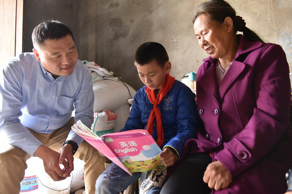 江蘇省鹽城市阜寧縣東溝中心小學(xué)三年級學(xué)生單澤華常年與奶奶一起生活,家里非常困難。在東溝鎮(zhèn)嵩乳村幫扶的鹽城市食品藥品監(jiān)管局干部沈剛(左一)多方籌集資金,幫扶這個(gè)家庭,并經(jīng)常關(guān)心孩子的學(xué)習(xí)和生活。蔣曉鵬 攝