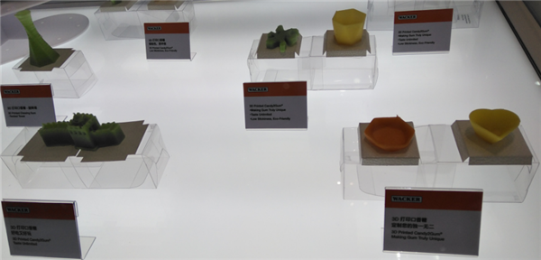 瓦克化學展出的主打技術(shù)就是它了?!安牧稀⒖诟猩?,和普通口香糖差不多,區(qū)別在于3D打印可以實現(xiàn)私人訂制,做成不同的性狀、刻上自己的名字等,不過,私人訂制成本會比較高,批量生產(chǎn)還是很劃算的?!惫ぷ魅藛T告訴記者。