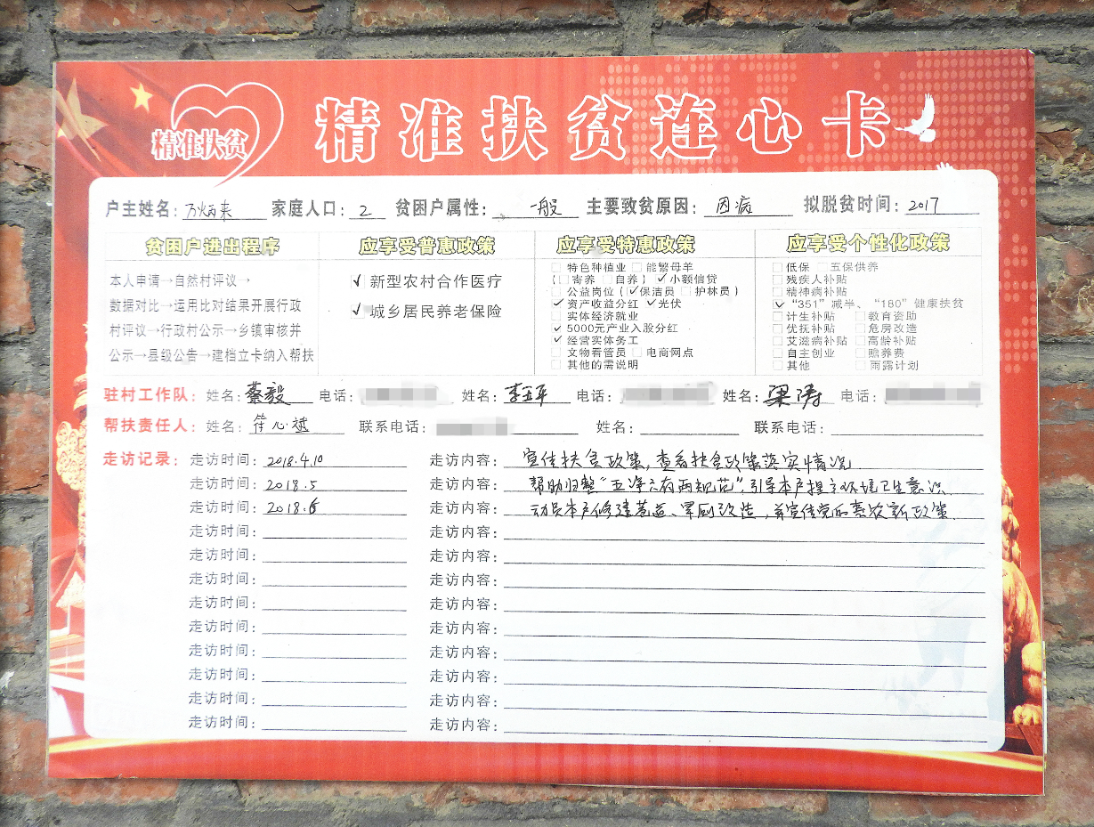 圖為萬炳來家堂屋外墻顯眼處張貼的“精準(zhǔn)扶貧連心卡”。