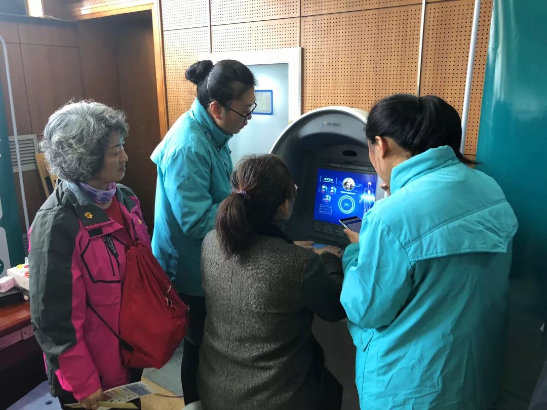 把雙手放到小機(jī)器人的檢測(cè)儀圓盤上,根據(jù)電腦提示操作,只要微信關(guān)注就能檢測(cè)出居民的健康情況,消化系統(tǒng)、神經(jīng)系統(tǒng)、腦力、睡眠等相關(guān)的健康指標(biāo)一下子就會(huì)出現(xiàn)在你的微信上?!罢媸巧衿姘。瓦@么一個(gè)小機(jī)器人就能看病啦,還這么快就出來(lái)體側(cè)報(bào)告,如今的科技越來(lái)越超前?!爆F(xiàn)場(chǎng)居民李大爺興奮看著這兩個(gè)小機(jī)器人。