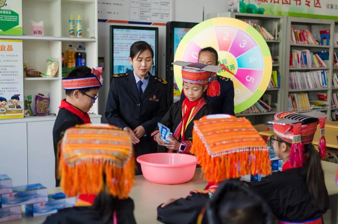 來賓市金秀瑤族自治縣市場監(jiān)督管理局開展食品藥品安全科普宣傳活動,圖為少數(shù)名族學生科普宣傳講座上工作人員演示鹽水去除農(nóng)殘互動環(huán)節(jié)。