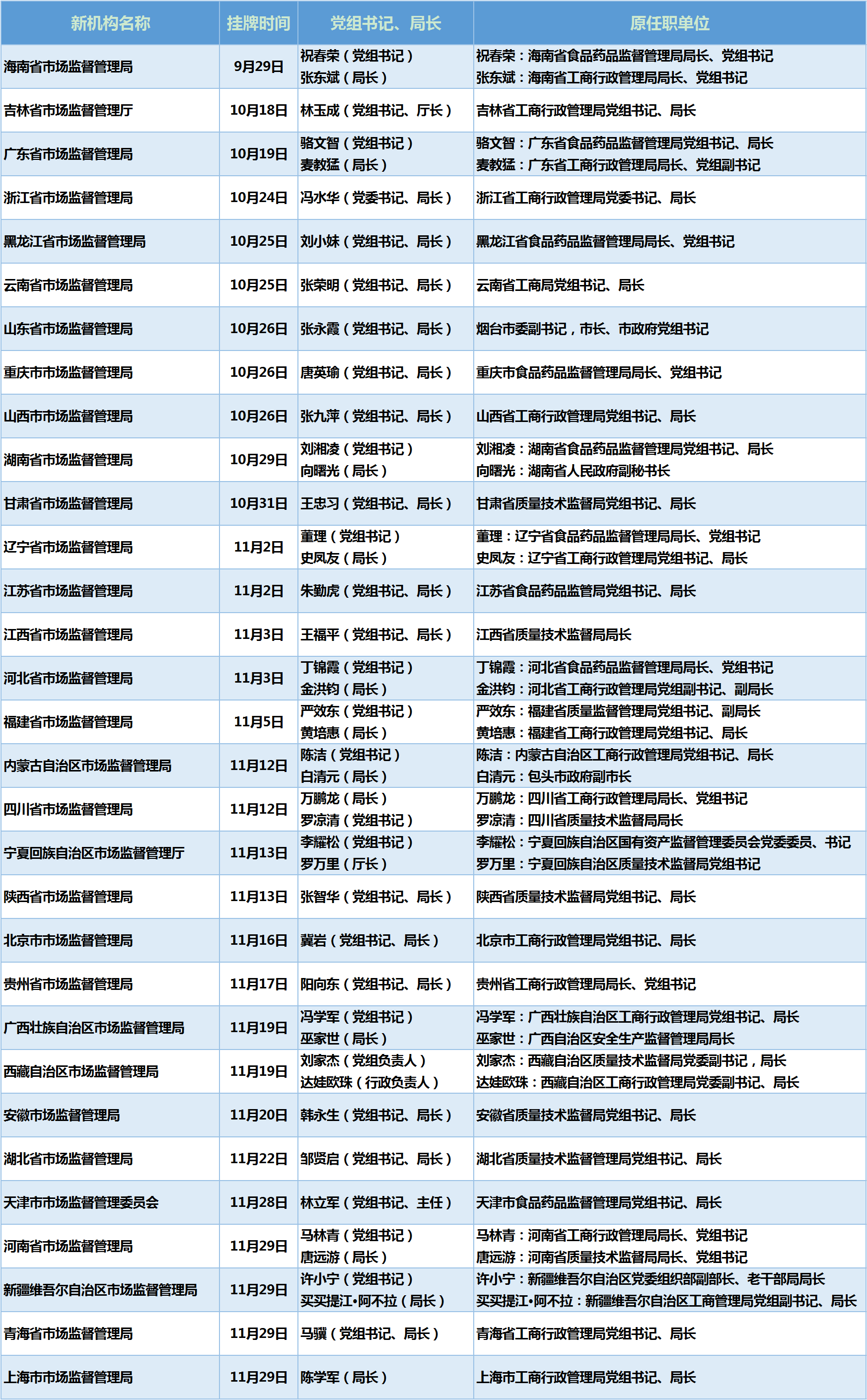 根據(jù)各省機構(gòu)改革具體實施方案和時間表,9月29日海南省市場監(jiān)管局掛牌成立,11月22日上海市十五屆人大常委會第七次會議表決通過了人事任免案。至此,全國31個省級市場監(jiān)督管理機構(gòu)均已正式掛牌成立,新領(lǐng)導班子陸續(xù)履新。據(jù)統(tǒng)計,原工商行政管理部門負責人擔任黨政一把手或者局長、黨組書記的達半數(shù)以上。