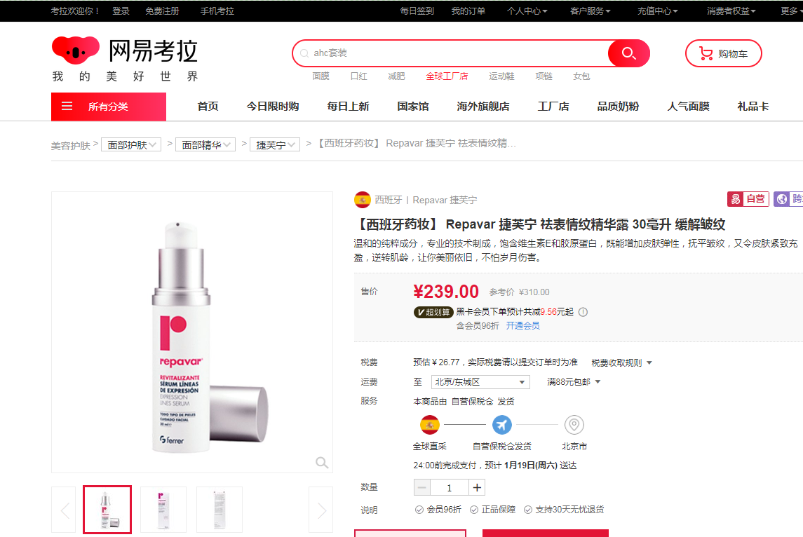 記者在網(wǎng)易考拉的平臺(tái)上,搜索"藥妝"也有不少西班牙、意大利和澳洲品牌的產(chǎn)品在簡(jiǎn)介中使用"藥妝"一詞。如Repavar捷芙寧特意標(biāo)注了 "西班牙藥妝"。