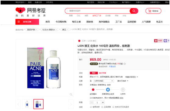 1月17日上午,記者在網(wǎng)易考拉上搜索,仍有不少產(chǎn)品以“藥妝”標(biāo)識(shí)。