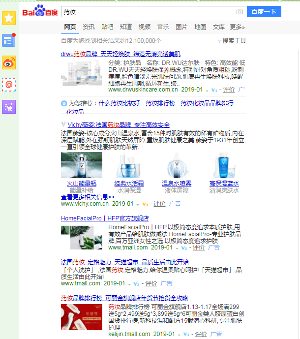 1月16日晚,記者在百度搜索"藥妝",出現(xiàn)的第一條鏈接為"Vichy薇姿:法國(guó)藥妝品牌 專(zhuān)注高效安全"