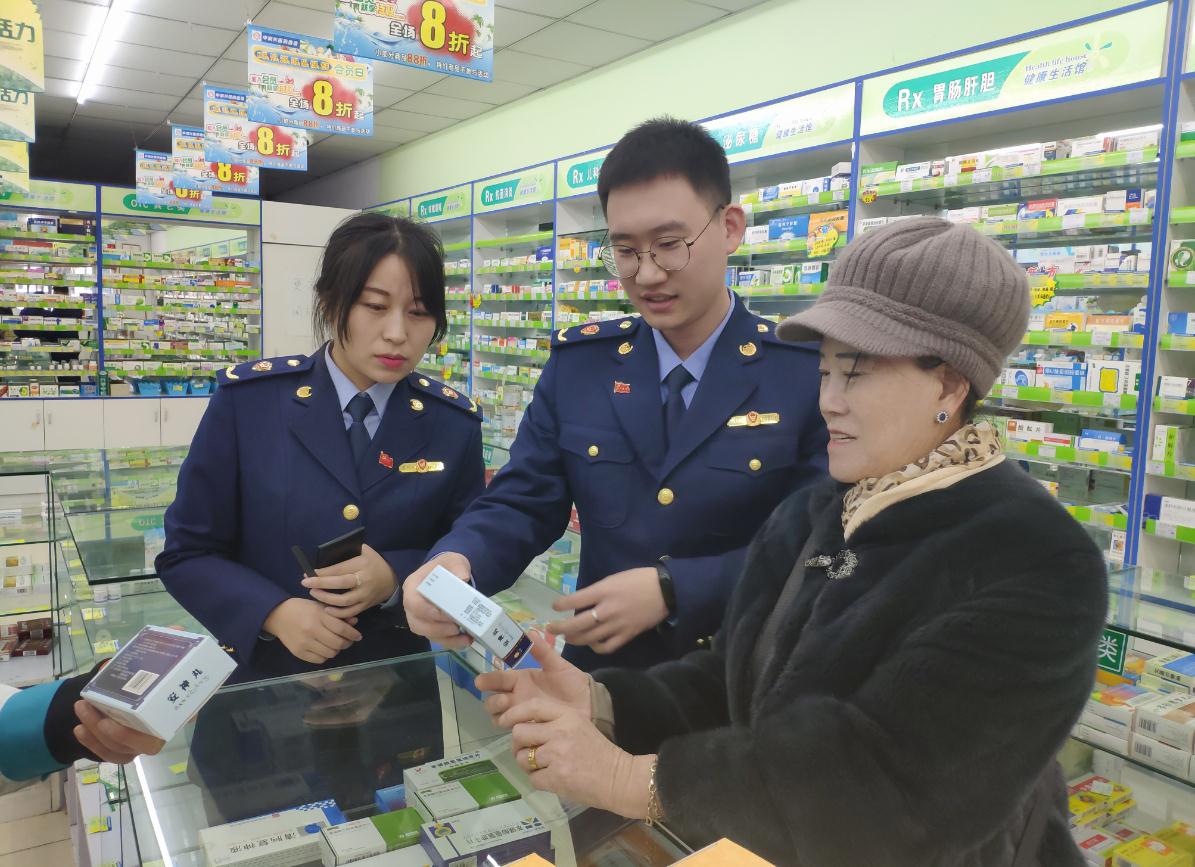 吉林省琿春市市場監(jiān)管局監(jiān)管人員在藥店向消費者普及安全用藥知識。記者 葉陽歡 攝