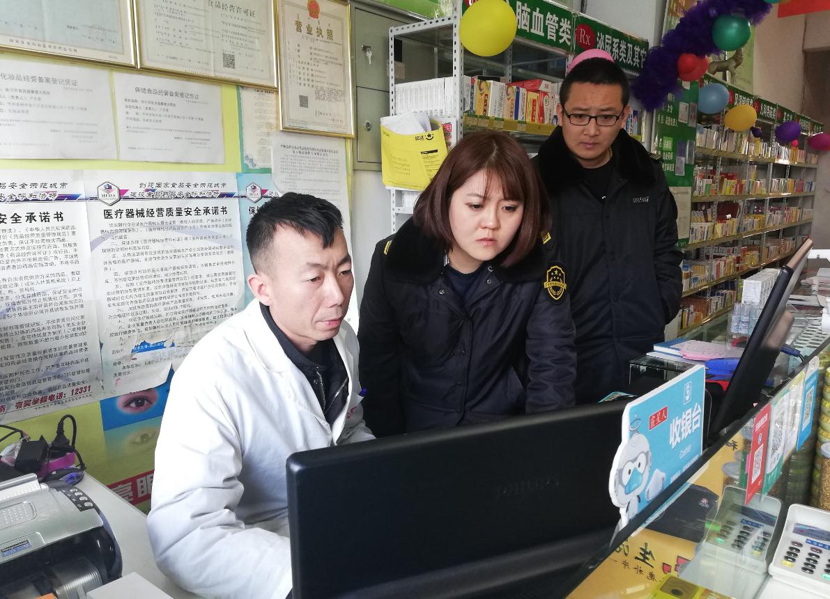 內(nèi)蒙古呼和浩特市食藥監(jiān)局開發(fā)區(qū)分局金川所監(jiān)管人員檢查藥店經(jīng)營和質(zhì)量管理系統(tǒng)。 本報記者 楊燕 攝