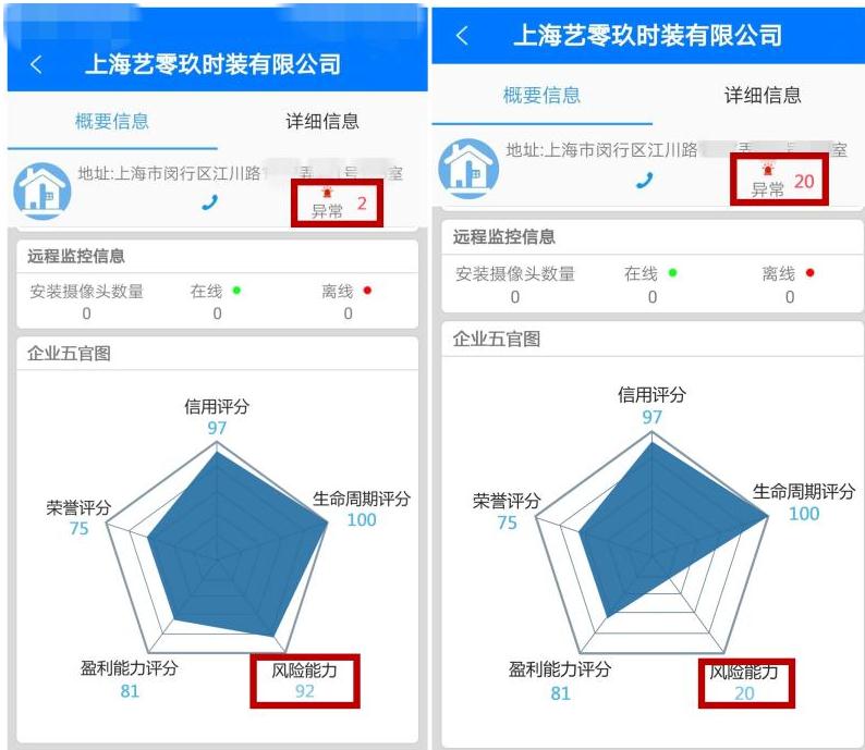 上海藝零玖?xí)r裝有限公司是閔行區(qū)互聯(lián)網(wǎng)誠(chéng)信聯(lián)盟的成員單位,但其“五官”中風(fēng)險(xiǎn)一項(xiàng)的數(shù)據(jù)卻在一個(gè)月內(nèi)出現(xiàn)“斷崖式”下跌——從92分的“風(fēng)險(xiǎn)極低”掉到了20分的“風(fēng)險(xiǎn)極高”。