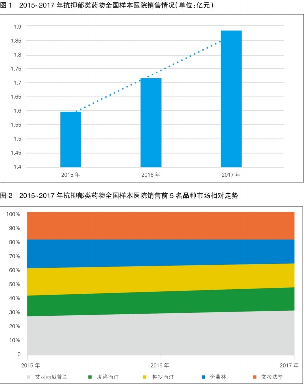 從2015~2017年抗抑郁類藥物全國樣本醫(yī)院銷售情況可以看出,我國抗抑郁藥物的使用量逐年遞增(見圖1)。2015~2017年,我國抗抑郁類藥物的市場銷售復合增長率為5.6%,2016年同比增長7.3%,2017年同比增長9.8%。2017年,我國抗抑郁類藥物的市場銷售額約為95億元,未來仍將保持平穩(wěn)增長。