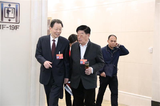 3月14日下午,十三屆全國(guó)人大二次會(huì)議舉行代表團(tuán)全體會(huì)議,審議政府工作報(bào)告、全國(guó)人大常委會(huì)工作報(bào)告等內(nèi)容。圖為全國(guó)人大代表、揚(yáng)子江藥業(yè)集團(tuán)董事長(zhǎng)徐鏡人(前右一)和全國(guó)人大常委會(huì)委員、全國(guó)人大教育科學(xué)文化衛(wèi)生委員會(huì)主任委員李學(xué)勇(前左一)在會(huì)議開(kāi)始前進(jìn)行交流。(《中國(guó)醫(yī)藥報(bào)》記者落楠 攝)