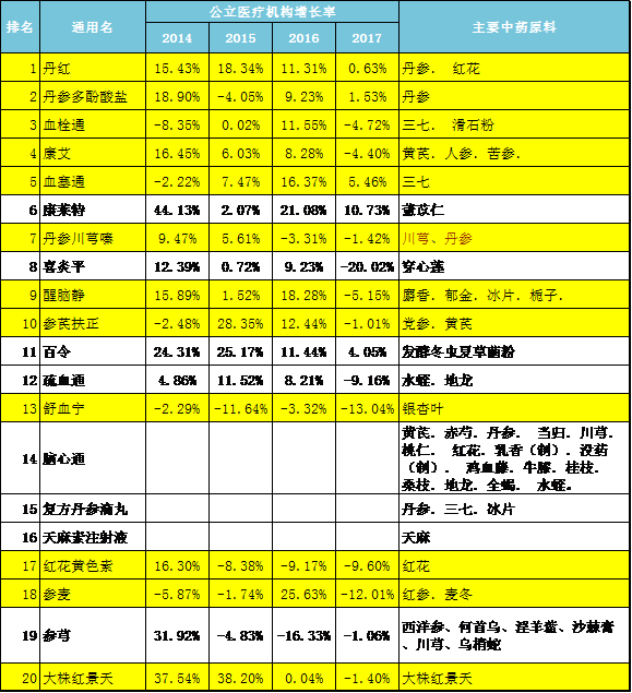 如表3,在國內(nèi)公立醫(yī)療機(jī)構(gòu)銷量前20位品種中,描黃色的是已被納入輔助用藥并重點(diǎn)監(jiān)控的品種,基本都是在醫(yī)療機(jī)構(gòu)銷售占比過高的中藥注射劑。被重點(diǎn)監(jiān)控后,其臨床銷售量預(yù)計(jì)會出現(xiàn)較大幅度下滑,從而影響到丹參、紅花、三七、人參等熱點(diǎn)中藥材的需求量。