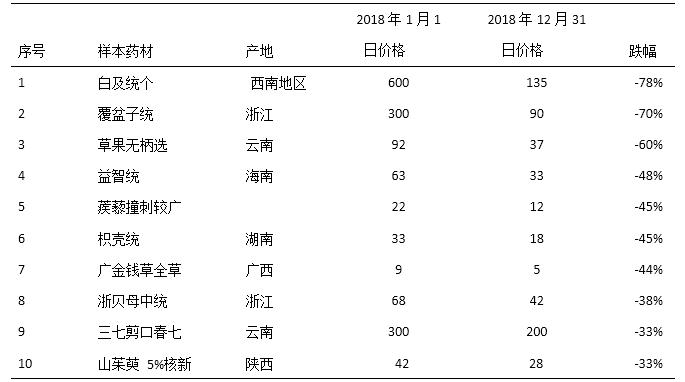 表2 2018年中藥材價格綜合200指數(shù)構(gòu)成品種跌幅前10位(中藥材天地網(wǎng))