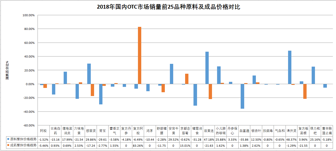 通過對2018年國內(nèi)OTC市場銷售前25位中成藥品種的原料及產(chǎn)品價格分析發(fā)現(xiàn),過去一年,25個樣本的中藥投料平均漲幅只有2.98%,除了金銀花、苦地丁等原藥材漲價因素外;還有人工牛黃、人工冰片、薄荷腦、熊云氧膽酸等中藥工業(yè)品漲價所致。