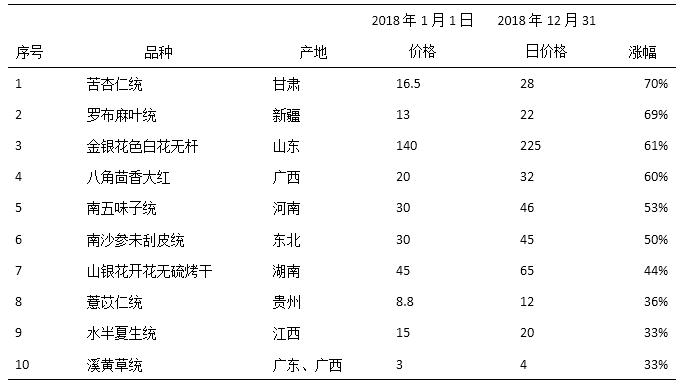 表1 2018年中藥材價格綜合200指數(shù)構(gòu)成品種漲幅前10位(中藥材天地網(wǎng))