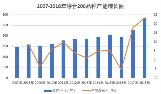 圖6 2007-2018年,綜合200品種產(chǎn)能增長示意圖(天地云圖大數(shù)據(jù))