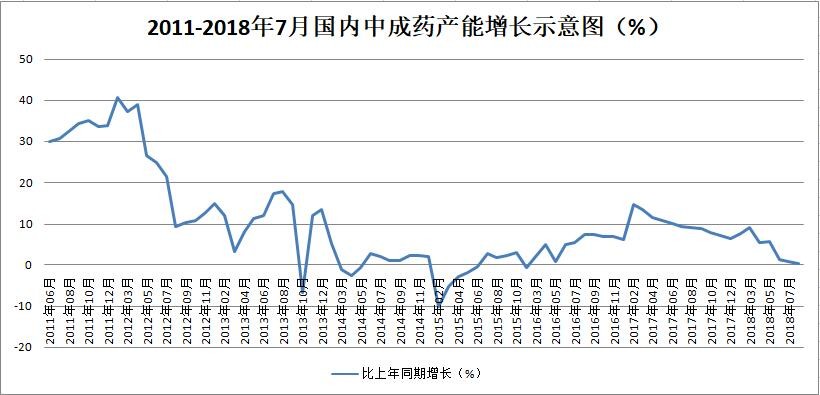 圖9 2011年-2018年7月,中成藥產(chǎn)能增長示意圖(據(jù)米內(nèi)網(wǎng)數(shù)據(jù)整理)