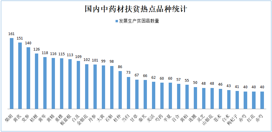 在大健康及中醫(yī)藥產(chǎn)業(yè)快速發(fā)展背景下,國內(nèi)供給側(cè)改革和精準(zhǔn)扶貧,發(fā)展中藥材生產(chǎn)成為熱點(diǎn)。據(jù)天地云圖大數(shù)據(jù)統(tǒng)計(jì)及抽樣調(diào)研, 2018年,全國585個貧困縣中,幾乎全在發(fā)展中藥材種植,擴(kuò)張前10位品種分別是柴胡、黃芪、黨參、桔梗、黃芩、黃精、重樓、板藍(lán)根、白及和金銀花。