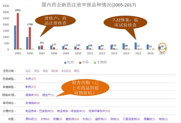 圖15 2005-2017年,國內(nèi)新藥注冊申報(bào)情況統(tǒng)計(jì)(根據(jù)原國家食藥監(jiān)總局發(fā)布數(shù)據(jù)整理)