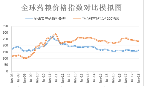 我們通過多項(xiàng)指數(shù)模擬,發(fā)現(xiàn)反映國內(nèi)中藥材市場行情運(yùn)行的中藥材天地網(wǎng)綜合200指數(shù)(以下簡稱綜合200指數(shù))運(yùn)行,與全球糧價緊密關(guān)聯(lián)。通過等比例縮放,二者保持錯峰相關(guān)性,即藥材價格下行,多在糧價下行半年后發(fā)生。原因是在藥糧比作用下,糧價過低會刺激各地加強(qiáng)藥材種植積極性,從而導(dǎo)致藥材跌價;反之亦然。