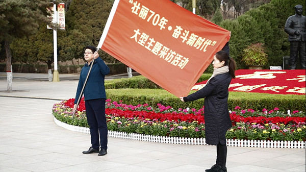 記者代表從黃坤明手中接過主題紅旗。紅旗迎風(fēng)飄揚(yáng)在革命圣地西柏坡,飄蕩在媒體人的心中。傳承革命精神,堅定理想信念,我們秉承著用心、用情、用功去講述新中國成立70年來的奮斗征程和輝煌成就,把主題采訪活動與增強(qiáng)“四力”結(jié)合起來,為創(chuàng)造良好的輿論環(huán)境、文化支撐與精神動力而共同努力奮進(jìn)。