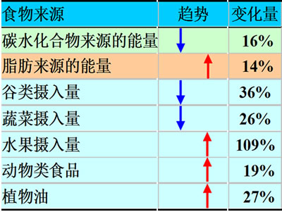 衛(wèi)生條件的改善和個人衛(wèi)生習慣的良性轉(zhuǎn)變,以及定期的婦科體檢是女性宮頸癌下降的主要原因。隨著居民營養(yǎng)狀況的較大改善,膳食模式改變成為導(dǎo)致一些腫瘤發(fā)病率迅速上升的原因。舉例來說,1985年與2000年相比,天津市年人均谷物攝入量下降了53.8千克,蔬菜攝入量減少了45.8千克,而動物類食品增加了3.7千克,植物油消耗增加了1.7千克。結(jié)果導(dǎo)致碳水化合物來源的能量由69%下降到53%,脂肪來源的能量由19%增加到33%。
