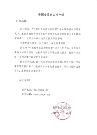 然而,就在4月19日,中國食品雜志社發(fā)布了一則聲明,表示“中國反食品添加劑聯(lián)盟”在未取得授權(quán)許可情況下,擅自將其作為這次活動(dòng)的媒體支持單位,給雜志社造成了極大的不良影響,并澄清與“中國反食品添加劑聯(lián)盟”沒有任何關(guān)系,也未給予媒體支持單位授權(quán)。